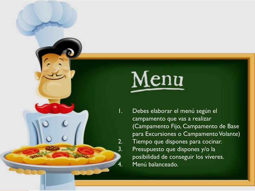 Debes elaborar el menú según el campamento que vas a realizar (Campamento Fijo, Campamento de Base para Excursiones o Campamento Volante) Tiempo que dispones para cocinar. Presupuesto que dispones y/o la posibilidad de conseguir los víveres. Menú balanceado.