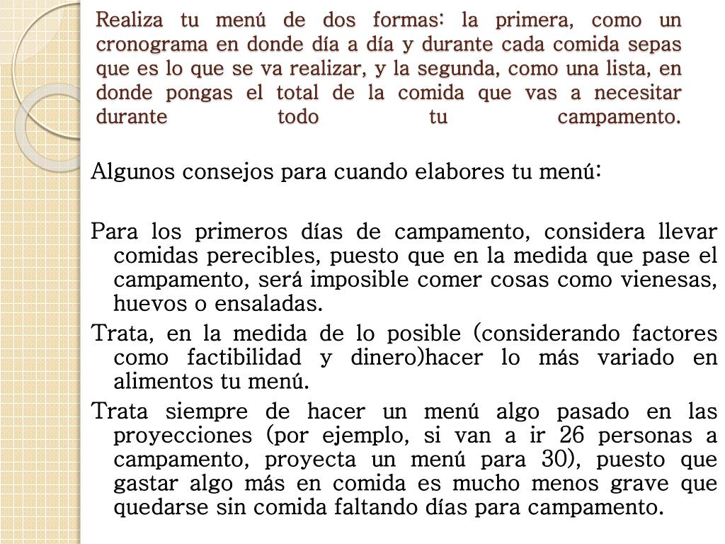 Realiza tu menú de dos formas: la primera, como un cronograma en donde día a día y durante cada comida sepas que es lo que se va realizar, y la segunda, como una lista, en donde pongas el total de la comida que vas a necesitar durante todo tu campamento. Algunos consejos para cuando elabores tu menú: Para los primeros días de campamento, considera llevar comidas perecibles, puesto que en la medida que pase el campamento, será imposible comer cosas como vienesas, huevos o ensaladas. Trata, en la medida de lo posible (considerando factores como factibilidad y dinero)hacer lo más variado en alimentos tu menú. Trata siempre de hacer un menú algo pasado en las proyecciones (por ejemplo, si van a ir 26 personas a campamento, proyecta un menú para 30), puesto que gastar algo más en comida es mucho menos grave que quedarse sin comida faltando días para campamento.