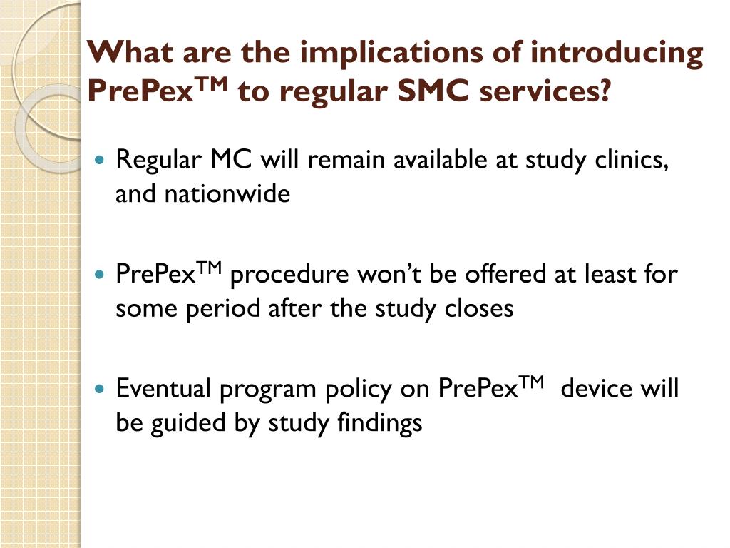 What are the implications of introducing PrePexTMto regular SMC services? • Regular MC will remain available at study clinics, and nationwide • PrePexTMprocedure won’t be offered at least for some period after the study closes • Eventual program policy on PrePexTM device will be guided by study findings