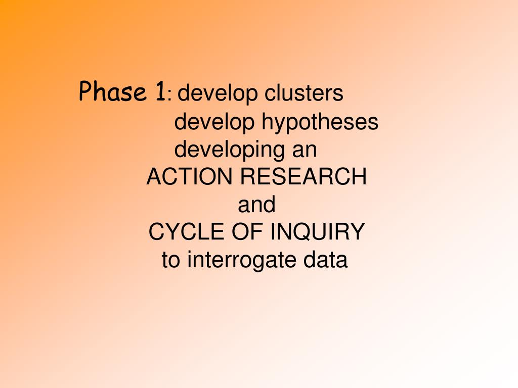 Phase 1: develop clusters • develop hypotheses • developing an • ACTION RESEARCH • and • CYCLE OF INQUIRY • to interrogate data