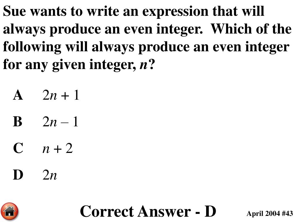 Sue wants to write an expression that will always produce an even integer. Which of the following will always produce an even integer for any given integer, n? A 2n + 1 B 2n – 1 Cn + 2 D 2n Correct Answer - D April 2004 #43