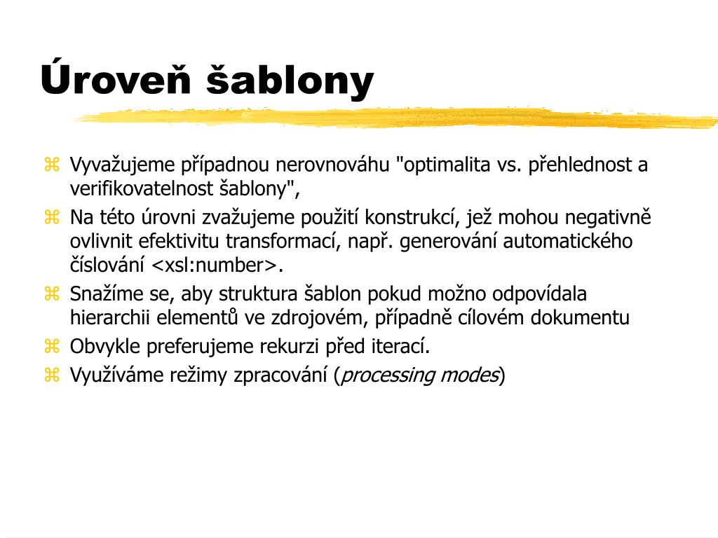 Úroveň šablony • Vyvažujeme případnou nerovnováhu "optimalita vs. přehlednost a verifikovatelnost šablony", • Na této úrovni zvažujeme použití konstrukcí, jež mohou negativně ovlivnit efektivitu transformací, např. generování automatického číslování <xsl:number>. • Snažíme se, aby struktura šablon pokud možno odpovídala hierarchii elementů ve zdrojovém, případně cílovém dokumentu • Obvykle preferujeme rekurzi před iterací. • Využíváme režimy zpracování (processing modes)