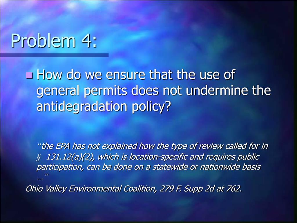 Problem 4: • How do we ensure that the use of general permits does not undermine the antidegradation policy? “the EPA has not explained how the type of review called for in § 131.12(a)(2), which is location-specific and requires public participation, can be done on a statewide or nationwide basis …” Ohio Valley Environmental Coalition, 279 F. Supp 2d at 762.