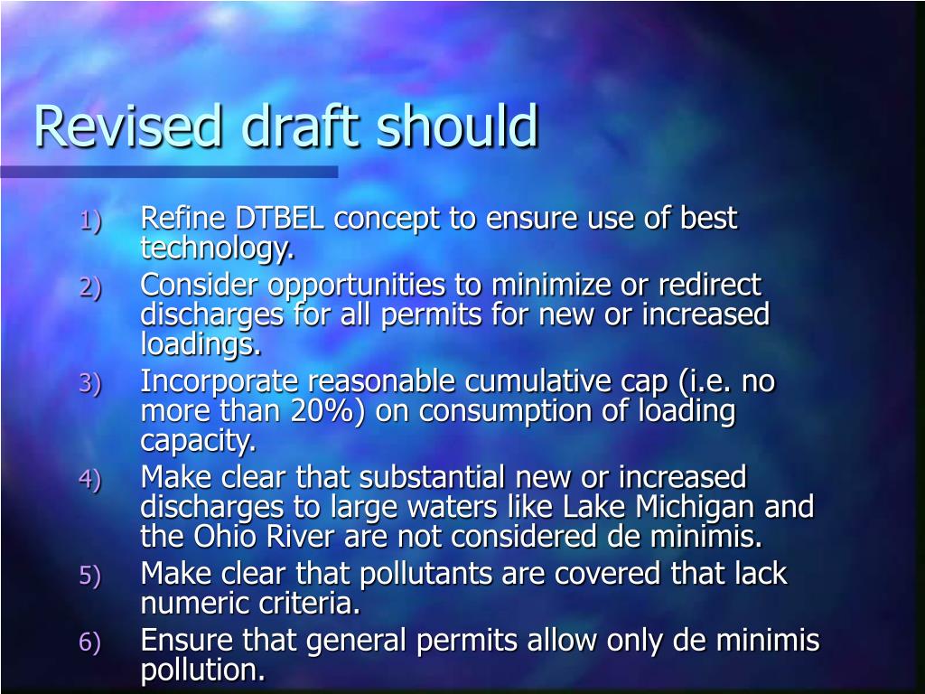 Revised draft should • Refine DTBEL concept to ensure use of best technology. • Consider opportunities to minimize or redirect discharges for all permits for new or increased loadings. • Incorporate reasonable cumulative cap (i.e. no more than 20%) on consumption of loading capacity. • Make clear that substantial new or increased discharges to large waters like Lake Michigan and the Ohio River are not considered de minimis. • Make clear that pollutants are covered that lack numeric criteria. • Ensure that general permits allow only de minimis pollution.