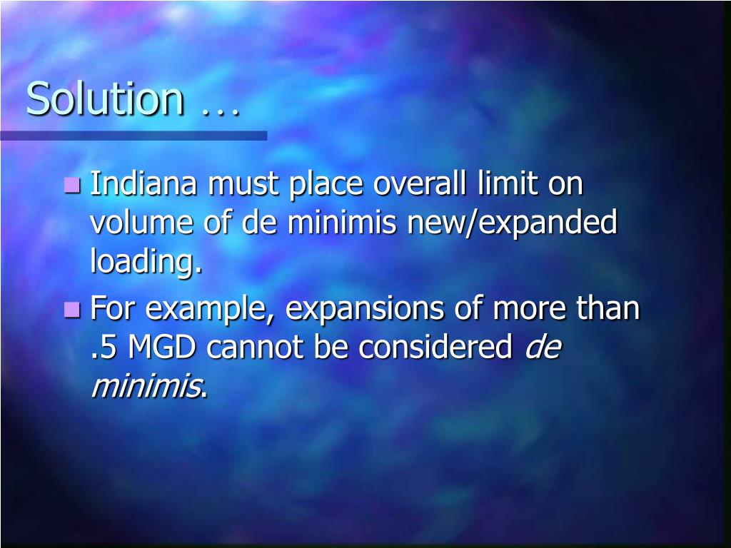Solution … • Indiana must place overall limit on volume of de minimis new/expanded loading. • For example, expansions of more than .5 MGD cannot be considered de minimis.