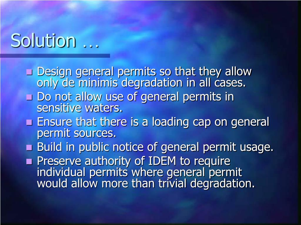 Solution … • Design general permits so that they allow only de minimis degradation in all cases. • Do not allow use of general permits in sensitive waters. • Ensure that there is a loading cap on general permit sources. • Build in public notice of general permit usage. • Preserve authority of IDEM to require individual permits where general permit would allow more than trivial degradation.