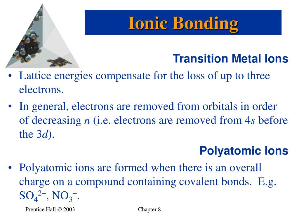 Ionic Bonding • Transition Metal Ions • Lattice energies compensate for the loss of up to three electrons. • In general, electrons are removed from orbitals in order of decreasing n (i.e. electrons are removed from 4s before the 3d). • Polyatomic Ions • Polyatomic ions are formed when there is an overall charge on a compound containing covalent bonds. E.g. SO42-, NO3-. Chapter 8