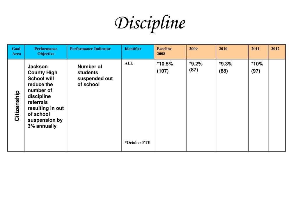 Discipline Jackson County High School will reduce the number of discipline referrals resulting in out of school suspension by 3% annually Number of students suspended out of school Citizenship