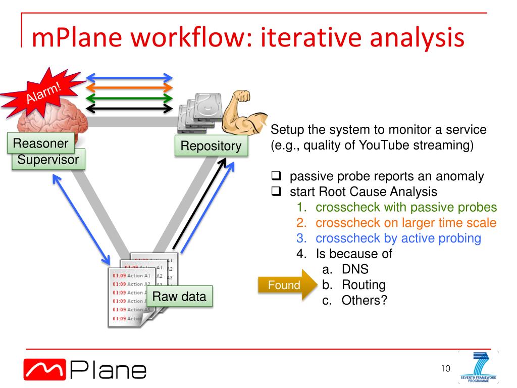 mPlane workflow: iterative analysis Alarm! • Setup the system to monitor a service • (e.g., quality of YouTube streaming) • passive probe reports an anomaly • start Root Cause Analysis • crosscheck with passive probes • crosscheck on larger time scale • crosscheck by active probing • Is because of • DNS • Routing • Others? Reasoner Supervisor Repository Found Raw data