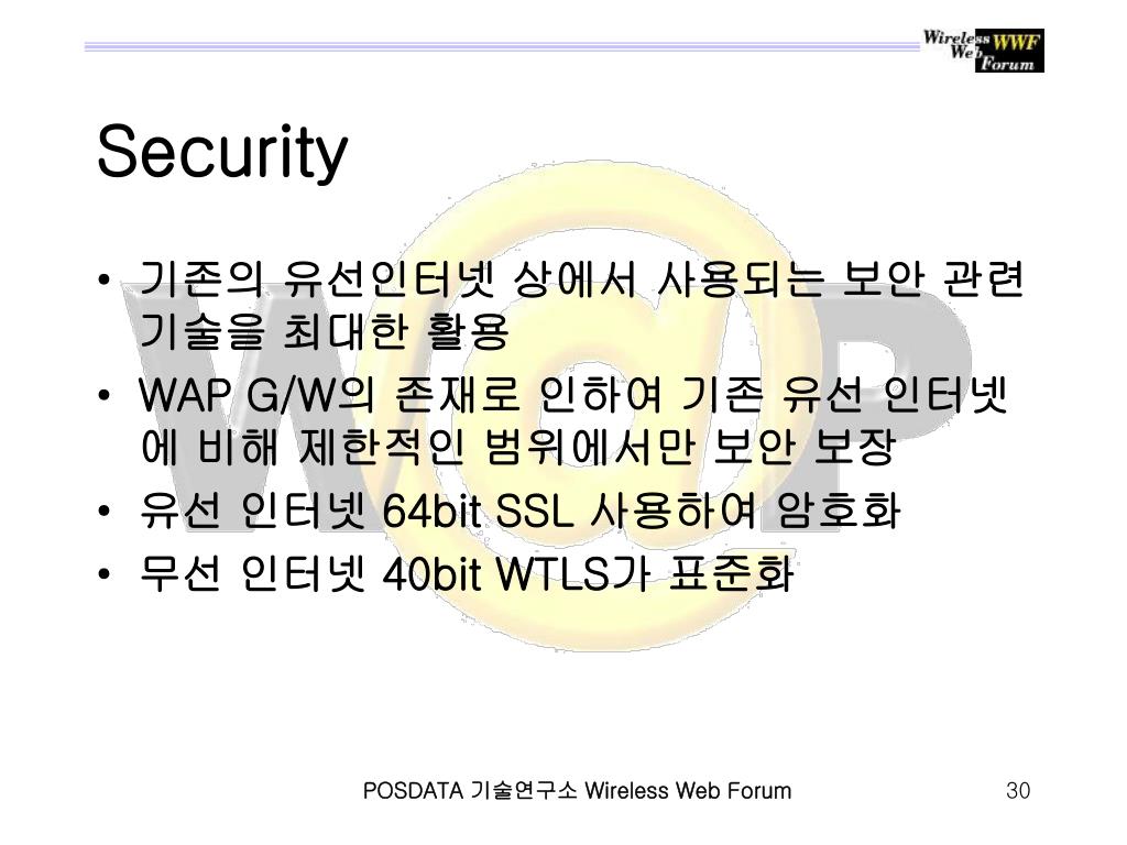 Security • 기존의 유선인터넷 상에서 사용되는 보안 관련 기술을 최대한 활용 • WAP G/W의 존재로 인하여 기존 유선 인터넷에 비해 제한적인 범위에서만 보안 보장 • 유선 인터넷 64bit SSL 사용하여 암호화 • 무선 인터넷 40bit WTLS가 표준화 POSDATA 기술연구소 Wireless Web Forum