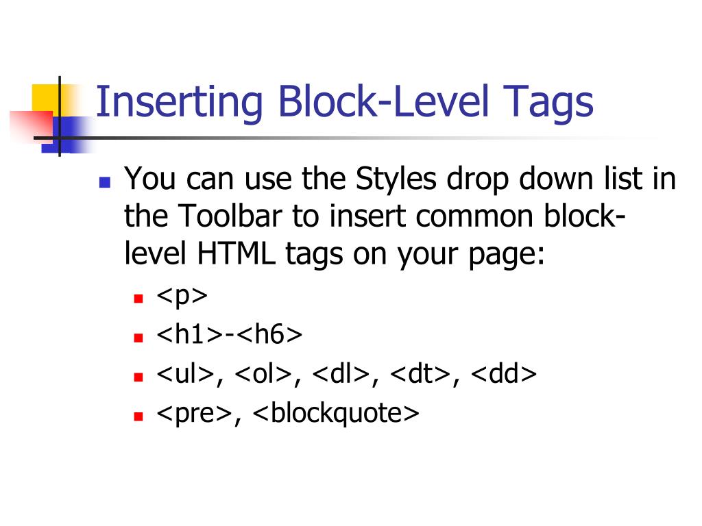 Inserting Block-Level Tags • You can use the Styles drop down list in the Toolbar to insert common block-level HTML tags on your page: • <p> • <h1>-<h6> • <ul>, <ol>, <dl>, <dt>, <dd> • <pre>, <blockquote>