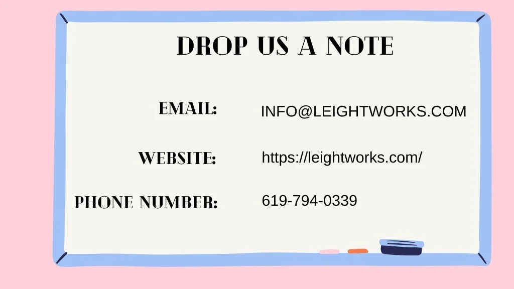 drop us a note Email: INFO@LEIGHTWORKS.COM https://leightworks.com/ Website: 619-794-0339 Phone Number: