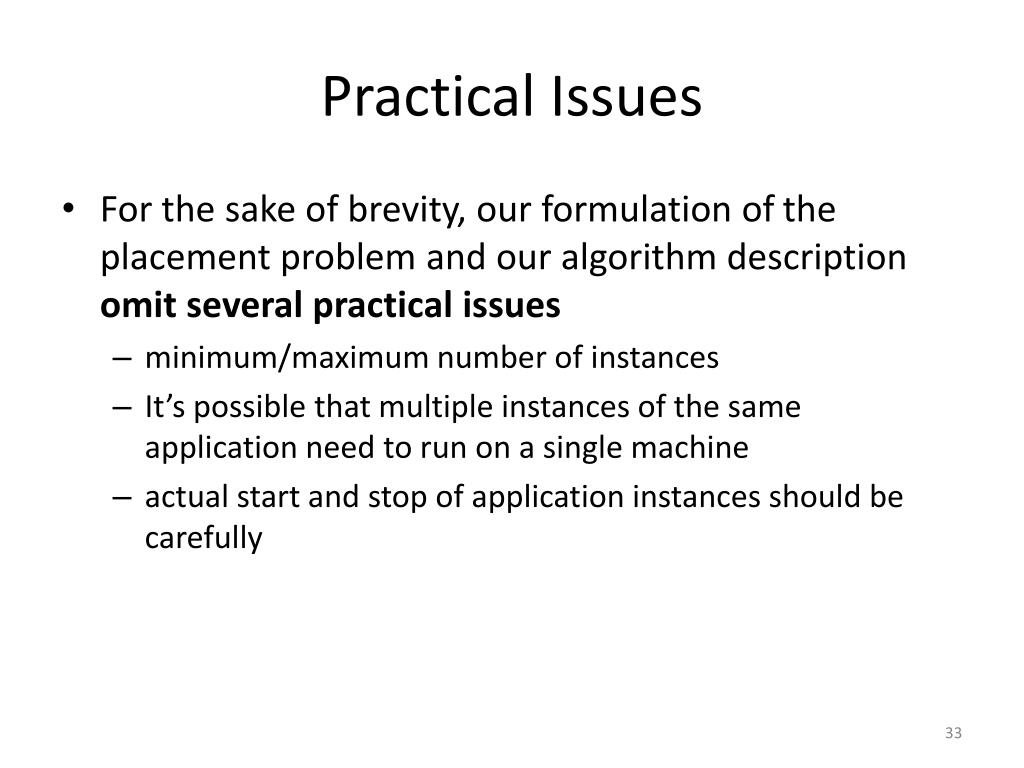 Practical Issues • For the sake of brevity, our formulation of theplacementproblem and our algorithmdescription omit several practicalissues • minimum/maximum number of instances • It’s possible that multiple instances of the same application need to run on a single machine • actual start and stop of application instances should be carefully