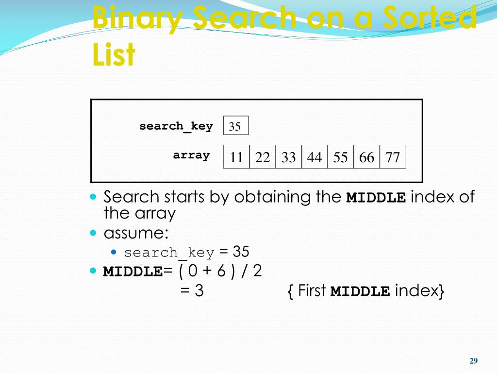 Binary Search on a Sorted List search_key 35 array • Search starts by obtaining the MIDDLE index of the array • assume: • search_key = 35 • MIDDLE= ( 0 + 6 ) / 2 = 3 { First MIDDLEindex} 29