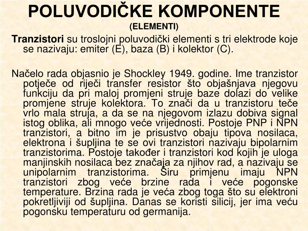 POLUVODIČKE KOMPONENTE (ELEMENTI) Tranzistori su troslojni poluvodički elementi s tri elektrode koje se nazivaju: emiter (E), baza (B) i kolektor (C). Načelo rada objasnio je Shockley 1949. godine. Ime tranzistor potječe od riječi transfer resistor što objašnjava njegovu funkciju da pri maloj promjeni struje baze dolazi do velike promjene struje kolektora. To znači da u tranzistoru teče vrlo mala struja, a da se na njegovom izlazu dobiva signal istog oblika, ali mnogo veće vrijednosti. Postoje PNP i NPN tranzistori, a bitno im je prisustvo obaju tipova nosilaca, elektrona i šupljina te se ovi tranzistori nazivaju bipolarnim tranzistorima. Postoje također i tranzistori kod kojih je uloga manjinskih nosilaca bez značaja za njihov rad, a nazivaju se unipolarnim tranzistorima. Širu primjenu imaju NPN tranzistori zbog veće brzine rada i veće pogonske temperature. Brzina rada je veća zbog toga što su elektroni pokretljiviji od šupljina. Danas se koristi silicij, jer ima veću pogonsku temperaturu od germanija.