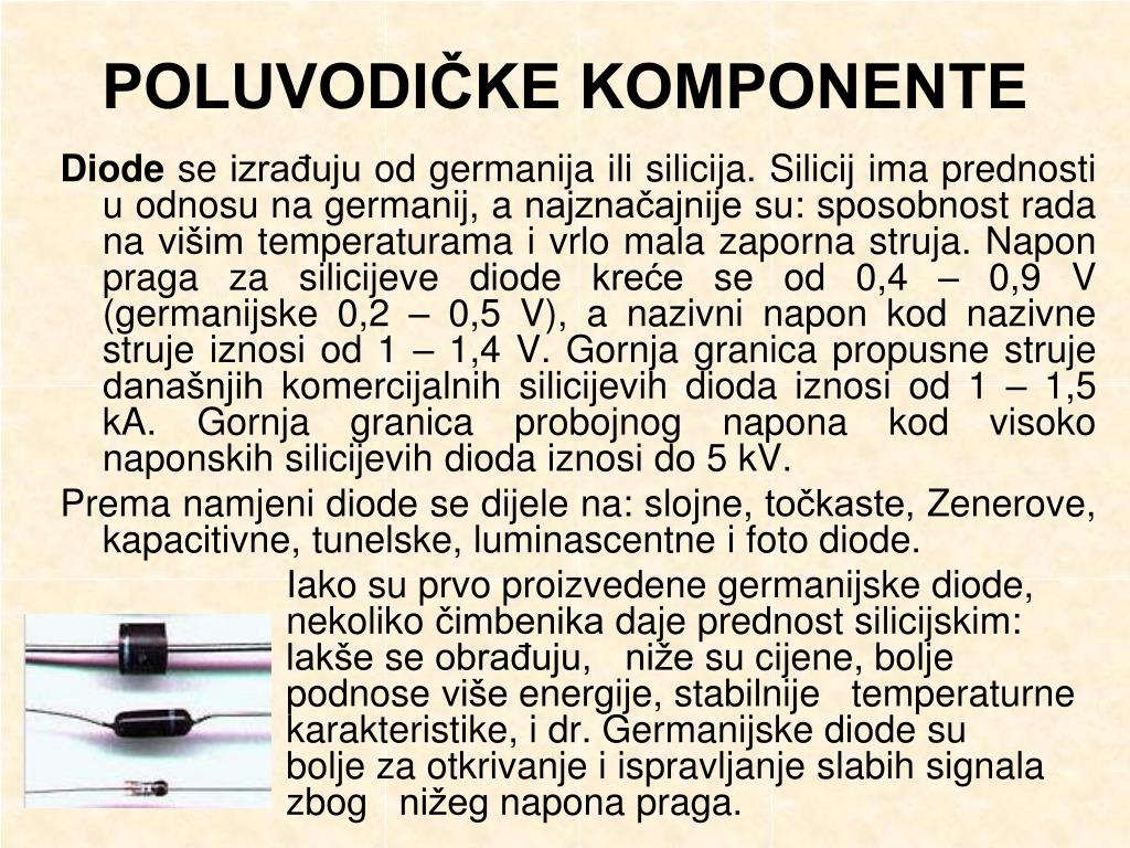 POLUVODIČKE KOMPONENTE Diode se izrađuju od germanija ili silicija. Silicij ima prednosti u odnosu na germanij, a najznačajnije su: sposobnost rada na višim temperaturama i vrlo mala zaporna struja. Napon praga za silicijeve diode kreće se od 0,4 – 0,9 V (germanijske 0,2 – 0,5 V), a nazivni napon kod nazivne struje iznosi od 1 – 1,4 V. Gornja granica propusne struje današnjih komercijalnih silicijevih dioda iznosi od 1 – 1,5 kA. Gornja granica probojnog napona kod visoko naponskih silicijevih dioda iznosi do 5 kV. Prema namjeni diode se dijele na: slojne, točkaste, Zenerove, kapacitivne, tunelske, luminascentne i foto diode. Iako su prvo proizvedene germanijske diode, nekoliko čimbenika daje prednost silicijskim: lakše se obrađuju, niže su cijene, bolje podnose više energije, stabilnije temperaturne karakteristike, i dr.Germanijske diode su bolje za otkrivanje i ispravljanje slabih signala zbog nižeg napona praga.