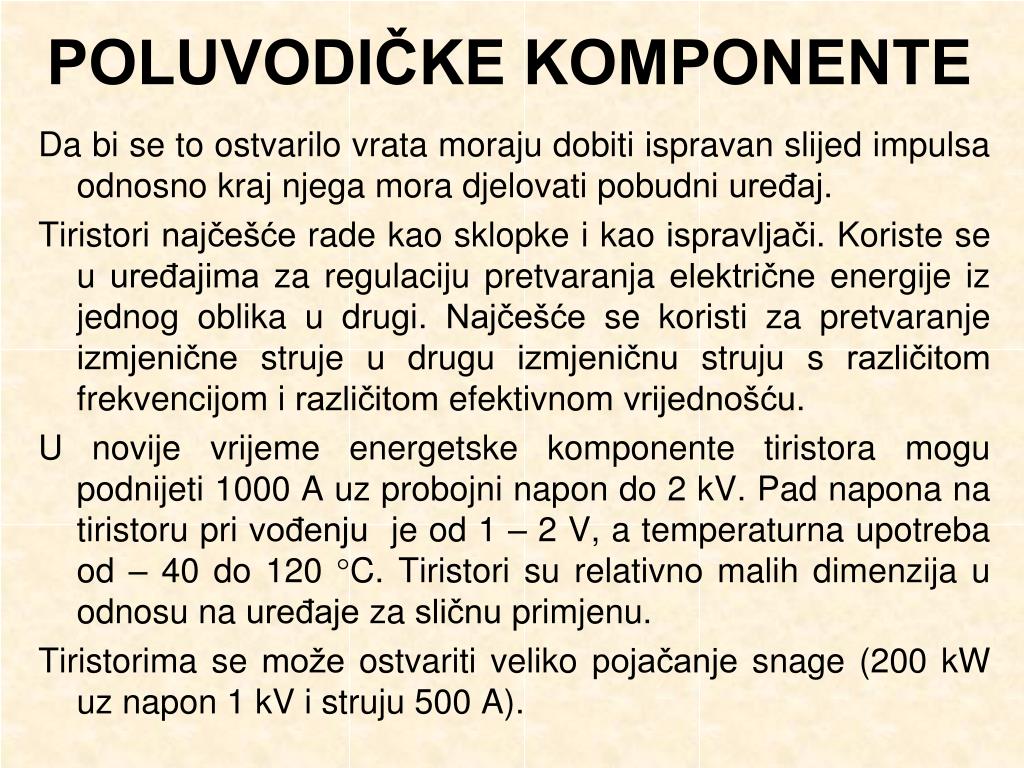 POLUVODIČKE KOMPONENTE Da bi se to ostvarilo vrata moraju dobiti ispravan slijed impulsa odnosno kraj njega mora djelovati pobudni uređaj. Tiristori najčešće rade kao sklopke i kao ispravljači. Koriste se u uređajima za regulaciju pretvaranja električne energije iz jednog oblika u drugi. Najčešće se koristi za pretvaranje izmjenične struje u drugu izmjeničnu struju s različitom frekvencijom i različitom efektivnom vrijednošću. U novije vrijeme energetske komponente tiristora mogu podnijeti 1000 A uz probojni napon do 2 kV. Pad napona na tiristoru pri vođenju je od 1 – 2 V, a temperaturna upotreba od – 40 do 120 C. Tiristori su relativno malih dimenzija u odnosu na uređaje za sličnu primjenu. Tiristorima se može ostvariti veliko pojačanje snage (200 kW uz napon 1 kV i struju 500 A).