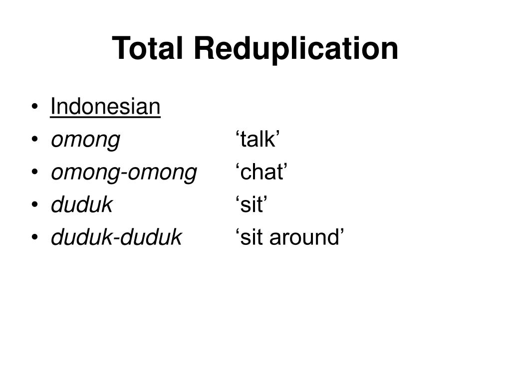 Total Reduplication • Indonesian • omong ‘talk’ • omong-omong ‘chat’ • duduk ‘sit’ • duduk-duduk ‘sit around’