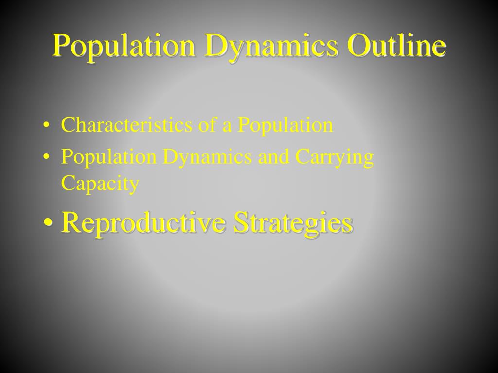 Population Dynamics Outline • Characteristics of a Population • Population Dynamics and Carrying Capacity • Reproductive Strategies
