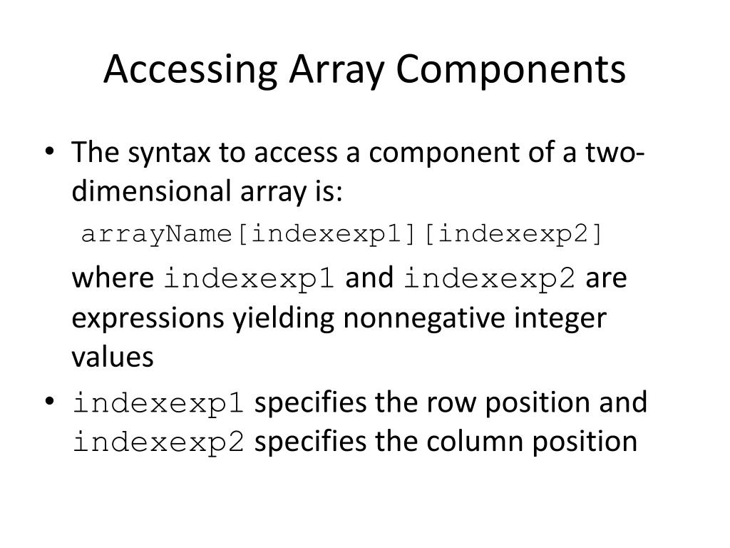 Accessing Array Components • The syntax to access a component of a two-dimensional array is: arrayName[indexexp1][indexexp2] where indexexp1 and indexexp2 are expressions yielding nonnegative integer values • indexexp1 specifies the row position and indexexp2 specifies the column position