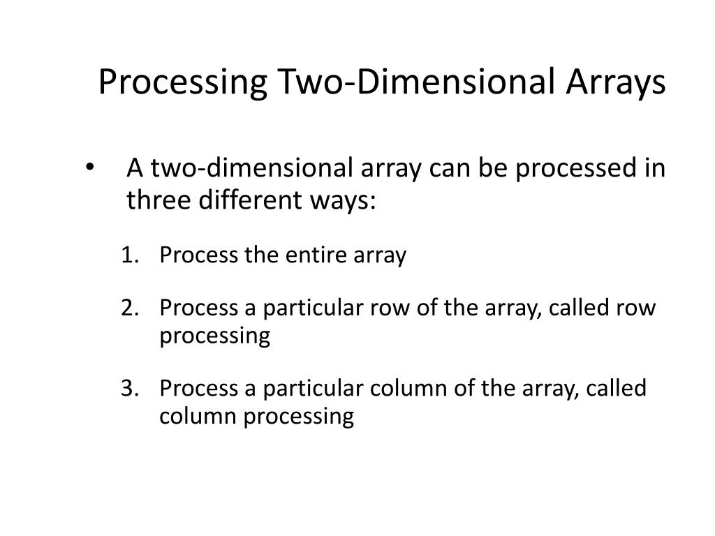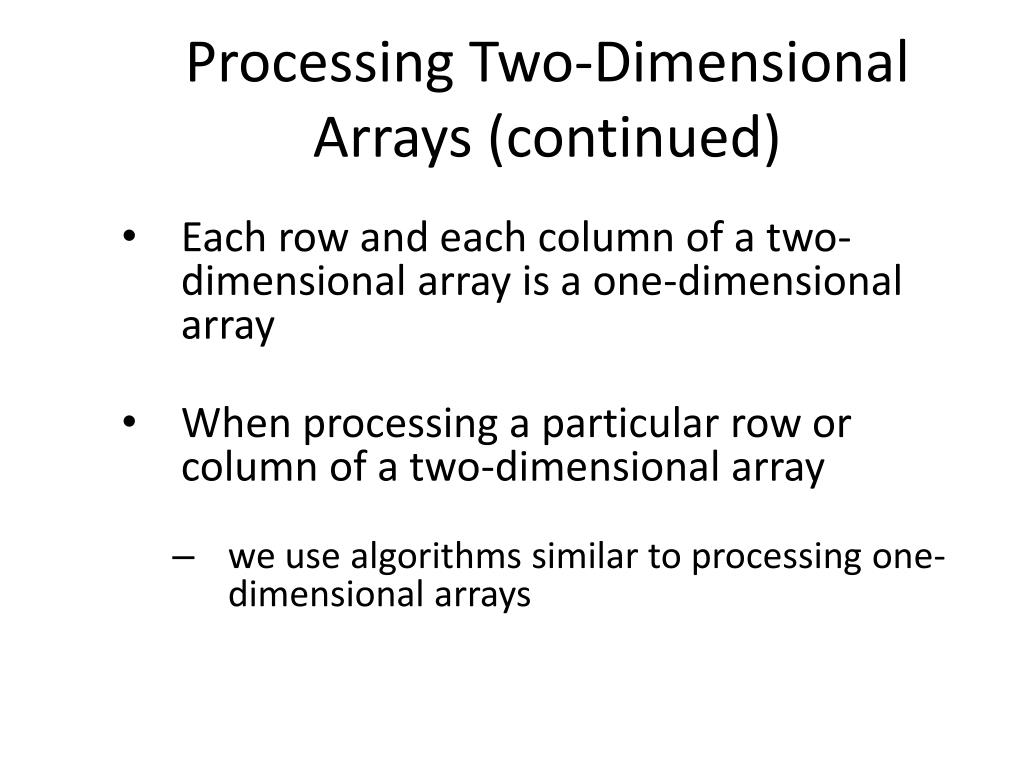 Processing Two-Dimensional Arrays (continued) • Each row and each column of a two-dimensional array is a one-dimensional array • When processing a particular row or column of a two-dimensional array • we use algorithms similar to processing one-dimensional arrays