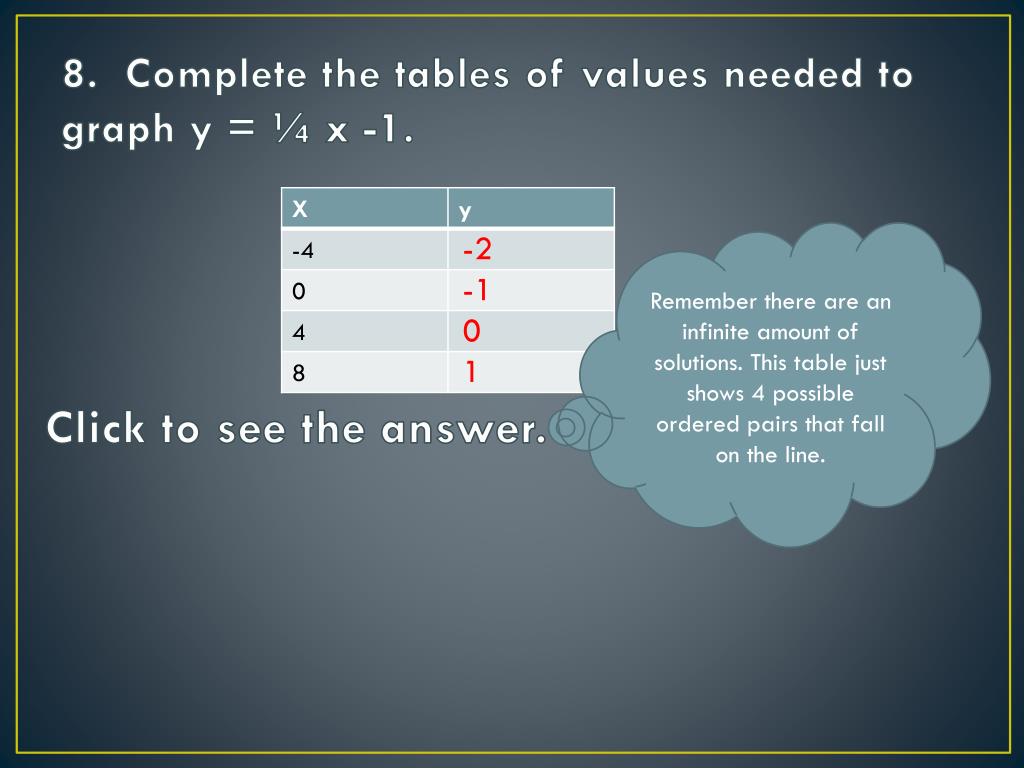 8. Complete the tables of values needed to graph y = ¼ x -1. -2 -1 0 1 Remember there are an infinite amount of solutions. This table just shows 4 possible ordered pairs that fall on the line. Click to see the answer.