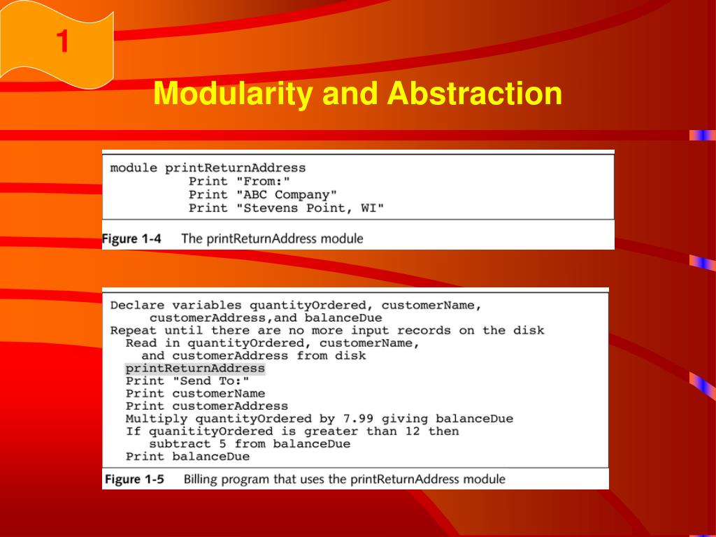 1 Modularity and Abstraction • Programming in the oldest procedural languages had two major disadvantages: • The programming process involved so much detail that the programmer (and any person reading the program) lost sight of the big picture • Similar statements required in various parts of the program had to be rewritten in more than one place • Writing programs became easier when programming languages began to allow the programmer to write methods • Using methods allows programmers to group statements together into modules or routines