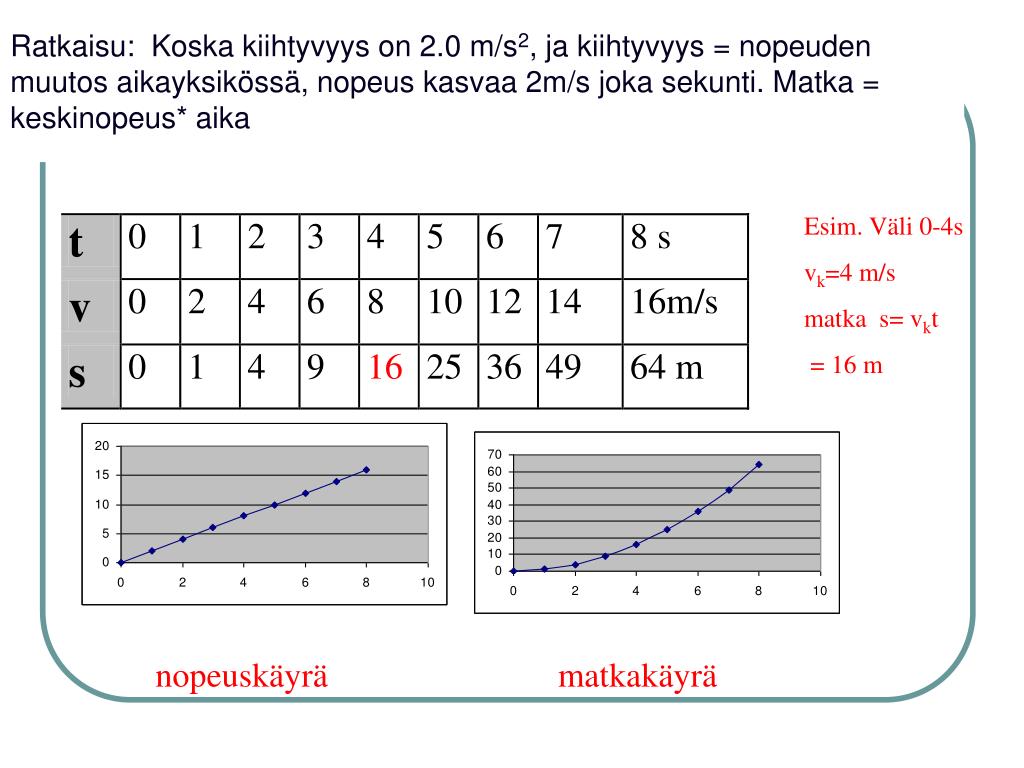 Ratkaisu: Koska kiihtyvyys on 2.0 m/s2, ja kiihtyvyys = nopeuden muutos aikayksikössä, nopeus kasvaa 2m/s joka sekunti. Matka = keskinopeus* aika Esim. Väli 0-4s vk=4 m/s matka s= vkt = 16 m nopeuskäyrä matkakäyrä