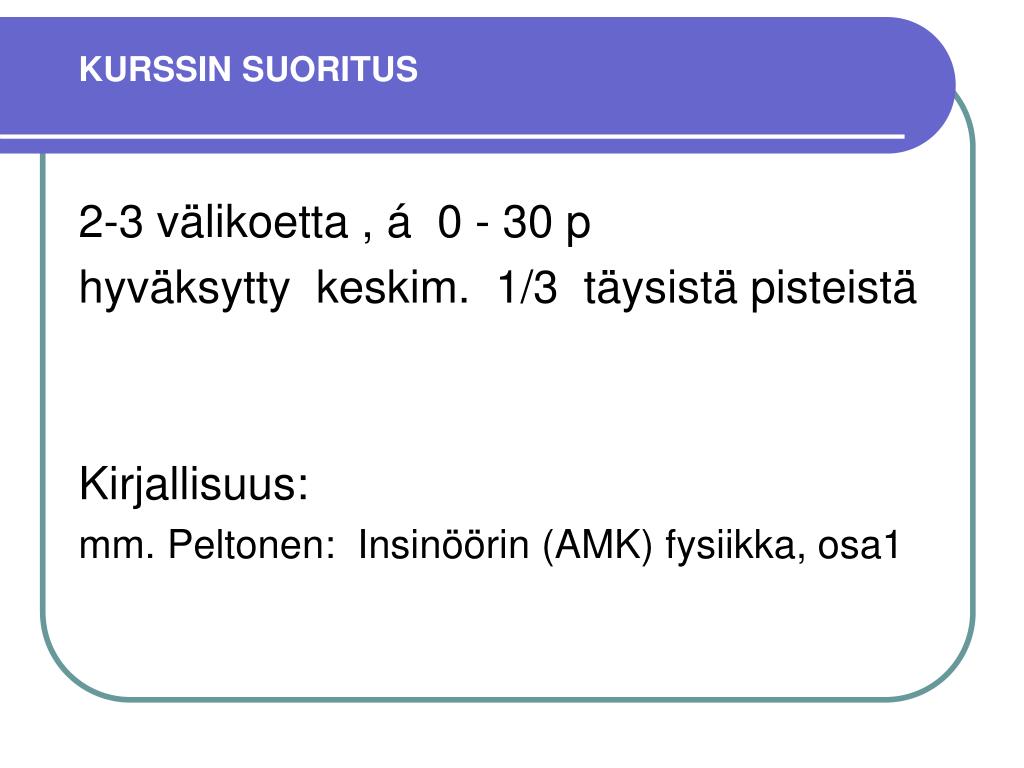 KURSSIN SUORITUS 2-3 välikoetta , á 0 - 30 p hyväksytty keskim. 1/3 täysistä pisteistä Kirjallisuus: mm. Peltonen: Insinöörin (AMK) fysiikka, osa1