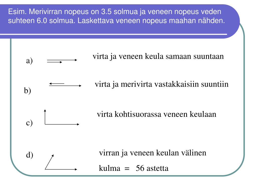 Esim. Merivirran nopeus on 3.5 solmua ja veneen nopeus veden suhteen 6.0 solmua. Laskettava veneen nopeus maahan nähden. virta ja veneen keula samaan suuntaan a) virta ja merivirta vastakkaisiin suuntiin b) virta kohtisuorassa veneen keulaan c) virran ja veneen keulan välinen kulma = 56 astetta d)