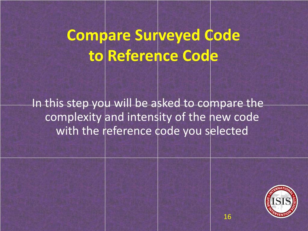 Compare Surveyed Code to Reference Code In this step you will be asked to compare the complexity and intensity of the new code with the reference code you selected