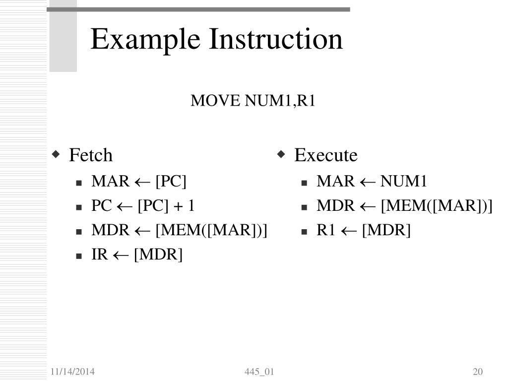 Fetch MAR [PC] PC [PC] + 1 MDR [MEM([MAR])] IR [MDR] Execute MAR NUM1 MDR [MEM([MAR])] R1 [MDR] Example Instruction MOVE NUM1,R1 445_01