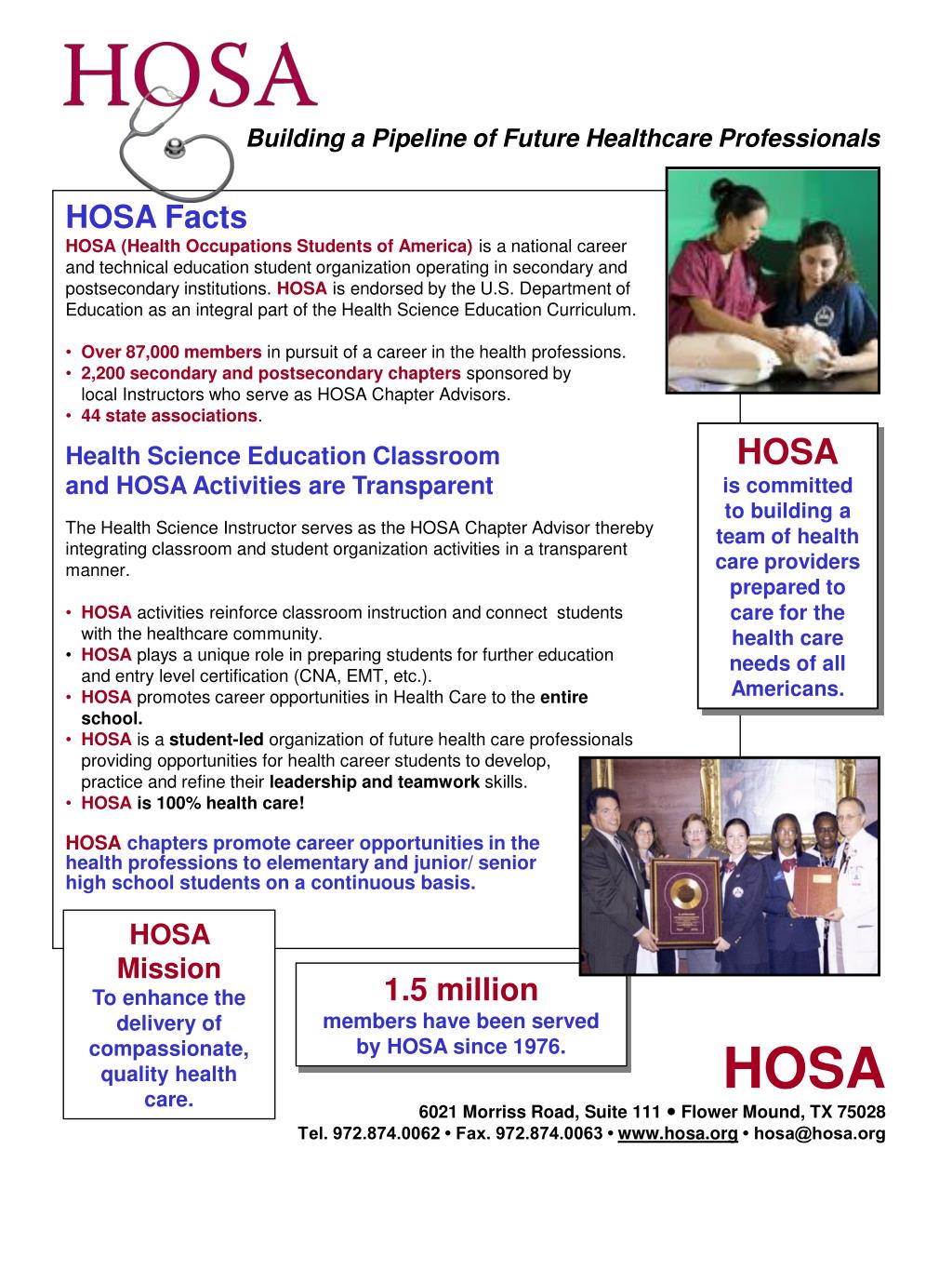 Building a Pipeline of Future Healthcare Professionals • HOSA Facts • HOSA (Health Occupations Students of America) is a national career and technical education student organization operating in secondary and • postsecondary institutions. HOSA is endorsed by the U.S. Department of • Education as an integral part of the Health Science Education Curriculum. • Over 87,000 members in pursuit of a career in the health professions. • 2,200 secondary and postsecondary chapters sponsored by • local Instructors who serve as HOSA Chapter Advisors. • 44 state associations. • Health Science Education Classroom • and HOSA Activities are Transparent • The Health Science Instructor serves as the HOSA Chapter Advisor thereby • integrating classroom and student organization activities in a transparent • manner. • HOSA activities reinforce classroom instruction and connect students • with the healthcare community. • HOSA plays a unique role in preparing students for further education • and entry level certification (CNA, EMT, etc.). • HOSA promotes career opportunities in Health Care to the entire school. • HOSA is a student-led organization of future health care professionals providing opportunities for health career students to develop, practice and refine their leadership and teamwork skills. • HOSA is 100% health care! • HOSA chapters promote career opportunities in the • health professions to elementary and junior/ senior • high school students on a continuous basis. HOSA is committed to building a team of health care providers prepared to care for the health care needs of all Americans. HOSA Mission To enhance the delivery of compassionate, quality health care. 1.5 million members have been served by HOSA since 1976. HOSA 6021 Morriss Road, Suite 111 Flower Mound, TX 75028 Tel. 972.874.0062 • Fax. 972.874.0063 • www.hosa.org • hosa@hosa.org