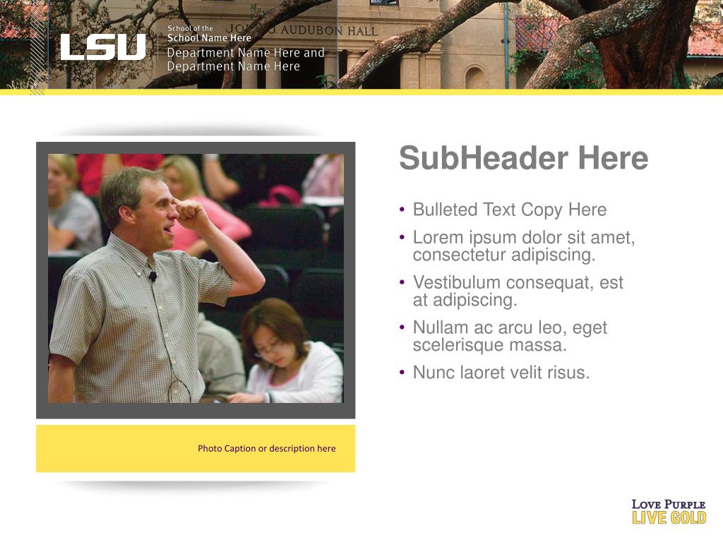 4. SubHeader Here • Bulleted Text Copy Here • Lorem ipsum dolor sit amet, consectetur adipiscing. • Vestibulum consequat, est at adipiscing. • Nullam ac arcu leo, eget scelerisque massa. • Nunc laoret velit risus. Photo Caption or description here