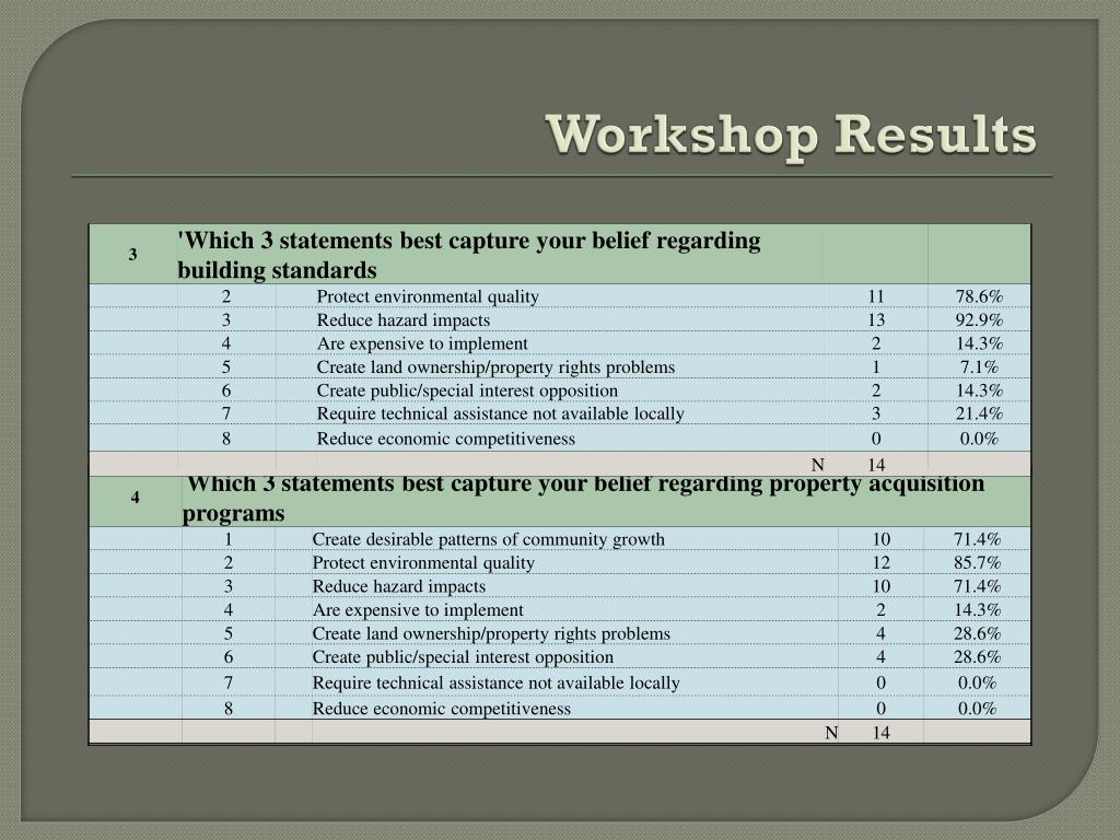 Additional Findings • In general, counties, with comprehensive planning, that adopt hazard relevant building codes and zoning regulations, that participate in FEMA CRS rating, and implement other similar policies, were more disaster resilient.