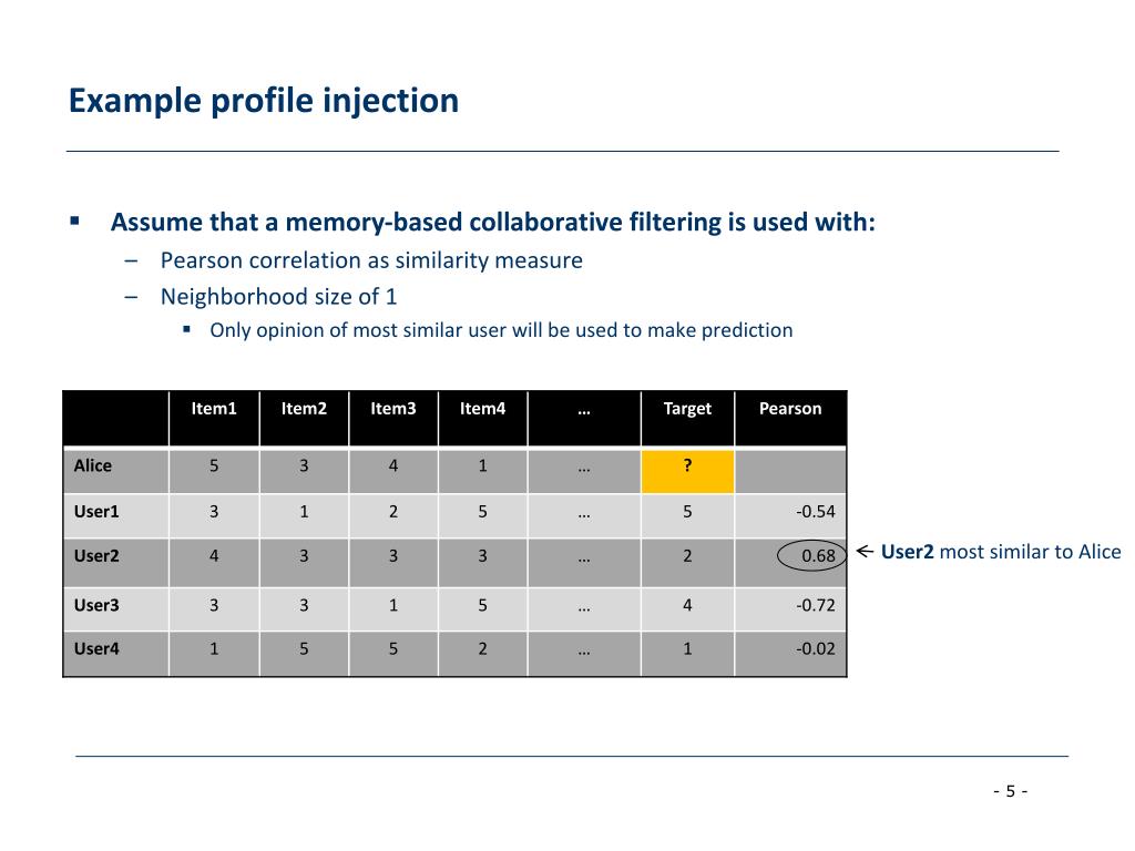 Example profile injection • Assume that a memory-based collaborative filtering is used with: • Pearson correlation as similarity measure • Neighborhood size of 1 • Only opinion of most similar user will be used to make prediction User2 most similar to Alice