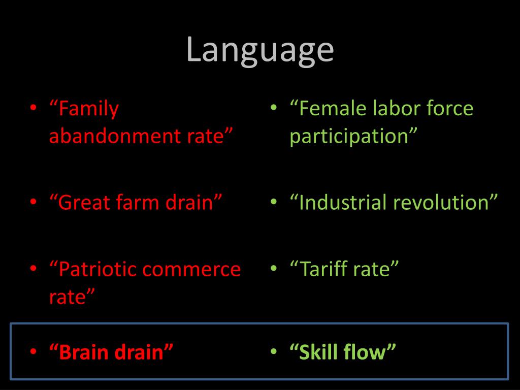 Language • “Family abandonment rate” • “Great farm drain” • “Patriotic commerce rate” • “Female labor force participation” • “Industrial revolution” • “Tariff rate” • “Brain drain” • “Skill flow”