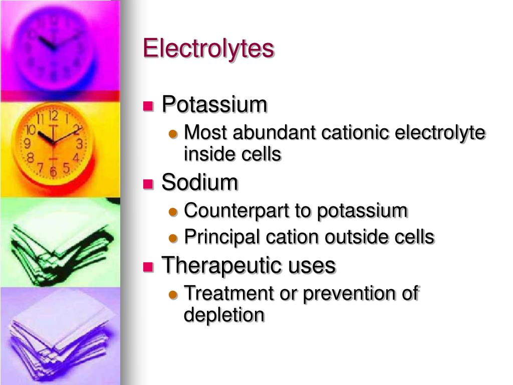 Electrolytes • Potassium • Most abundant cationic electrolyte inside cells • Sodium • Counterpart to potassium • Principal cation outside cells • Therapeutic uses • Treatment or prevention of depletion