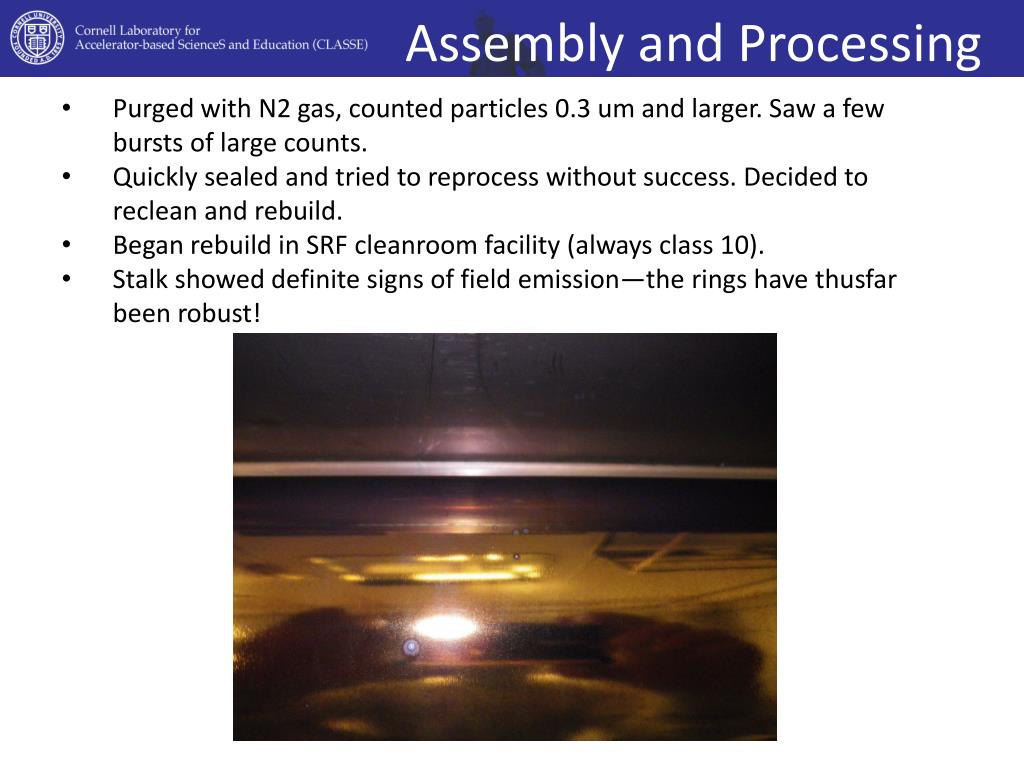 Assembly and Processing • Purged with N2 gas, counted particles 0.3 um and larger. Saw a few bursts of large counts. • Quickly sealed and tried to reprocess without success. Decided to reclean and rebuild. • Began rebuild in SRF cleanroom facility (always class 10). • Stalk showed definite signs of field emission—the rings have thusfar been robust!