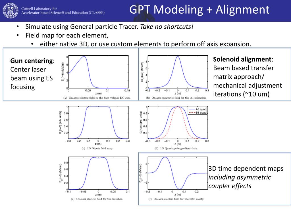 GPT Modeling + Alignment • Simulate using General particle Tracer. Take no shortcuts! • Field map for each element, • either native 3D, or use custom elements to perform off axis expansion. Solenoid alignment: Beam based transfer matrix approach/ mechanical adjustment iterations (~10 um) Gun centering: Center laser beam using ES focusing 3D time dependent maps including asymmetric coupler effects