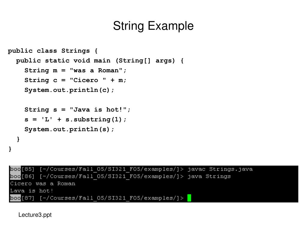 String Example public class Strings { public static void main (String[] args) { String m = "was a Roman"; String c = "Cicero " + m; System.out.println(c); String s = "Java is hot!"; s = 'L' + s.substring(1); System.out.println(s); } }