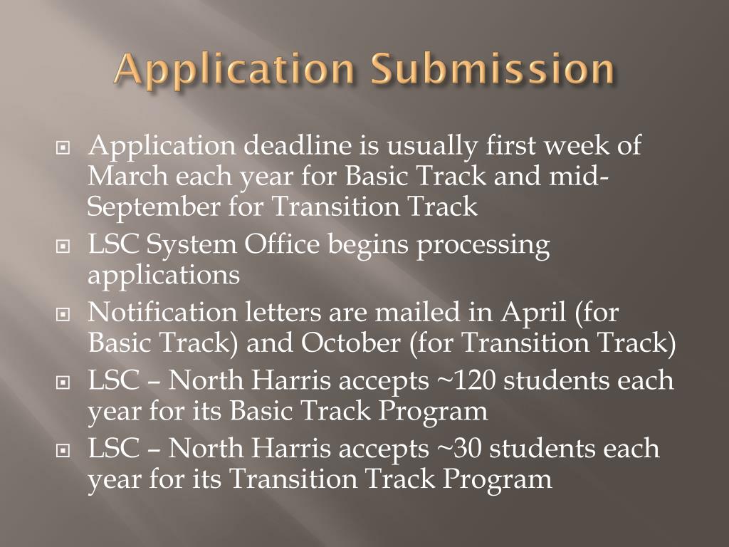 Application Submission • Application deadline is usually first week of March each year for Basic Track and mid-September for Transition Track • LSC System Office begins processing applications • Notification letters are mailed in April (for Basic Track) and October (for Transition Track) • LSC – North Harris accepts ~120 students each year for its Basic Track Program • LSC – North Harris accepts ~30 students each year for its Transition Track Program