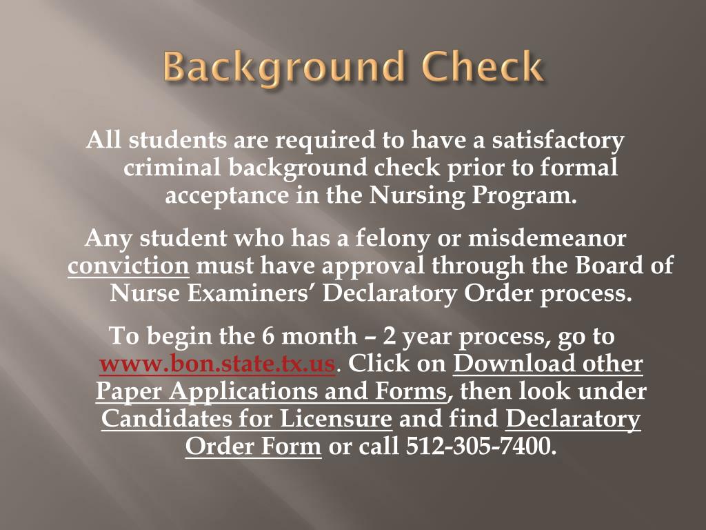 Background Check All students are required to have a satisfactory criminal background check prior to formal acceptance in the Nursing Program. Any student who has a felony or misdemeanor conviction must have approval through the Board of Nurse Examiners’ Declaratory Order process. To begin the 6 month – 2 year process, go towww.bon.state.tx.us. Click on Download other Paper Applications and Forms, then look under Candidates for Licensure and find Declaratory Order Form or call 512-305-7400.
