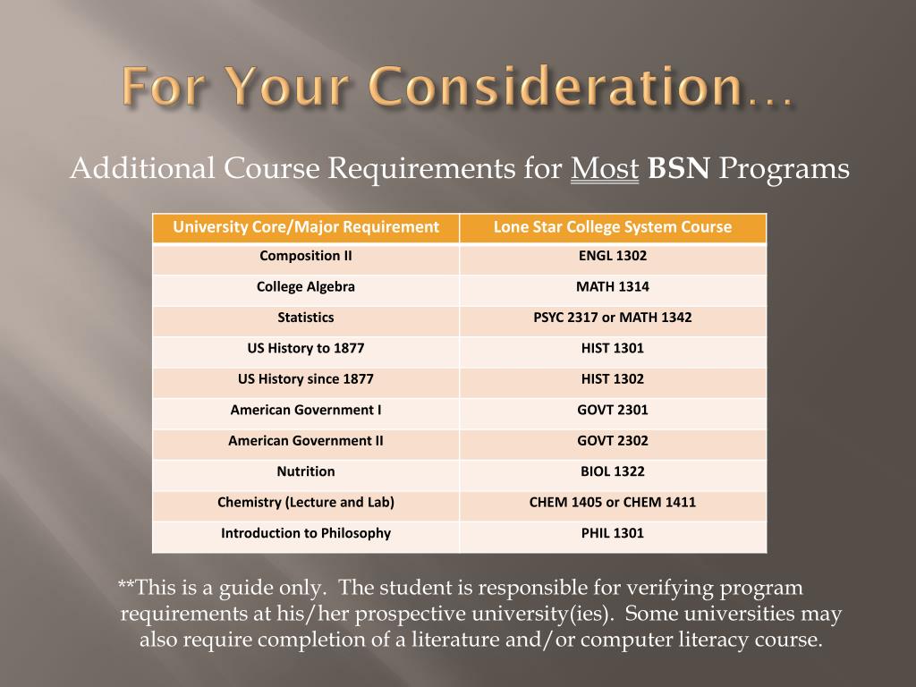For Your Consideration… Additional Course Requirements for MostBSN Programs **This is a guide only. The student is responsible for verifying program requirements at his/her prospective university(ies). Some universities may also require completion of a literature and/or computer literacy course.