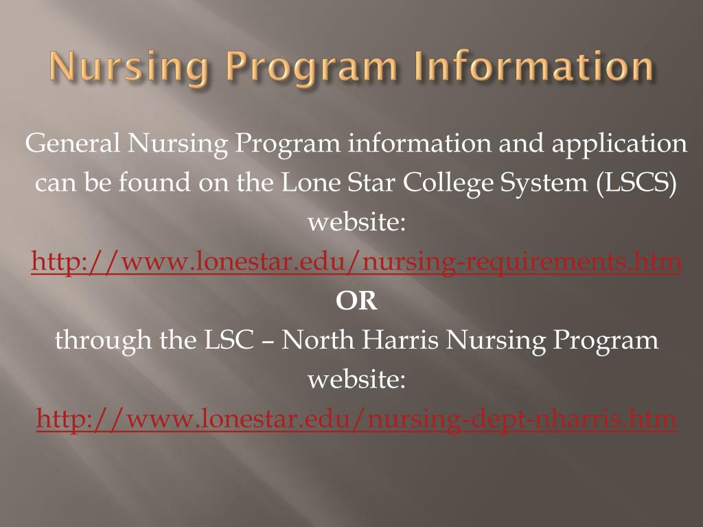 Nursing Program Information General Nursing Program information and application can be found on the Lone Star College System (LSCS) website: http://www.lonestar.edu/nursing-requirements.htm OR through the LSC – North Harris Nursing Program website: http://www.lonestar.edu/nursing-dept-nharris.htm