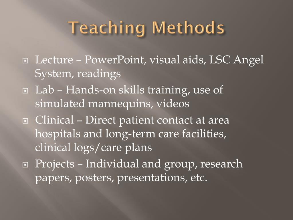 Teaching Methods • Lecture – PowerPoint, visual aids, LSC Angel System, readings • Lab – Hands-on skills training, use of simulated mannequins, videos • Clinical – Direct patient contact at area hospitals and long-term care facilities, clinical logs/care plans • Projects – Individual and group, research papers, posters, presentations, etc.