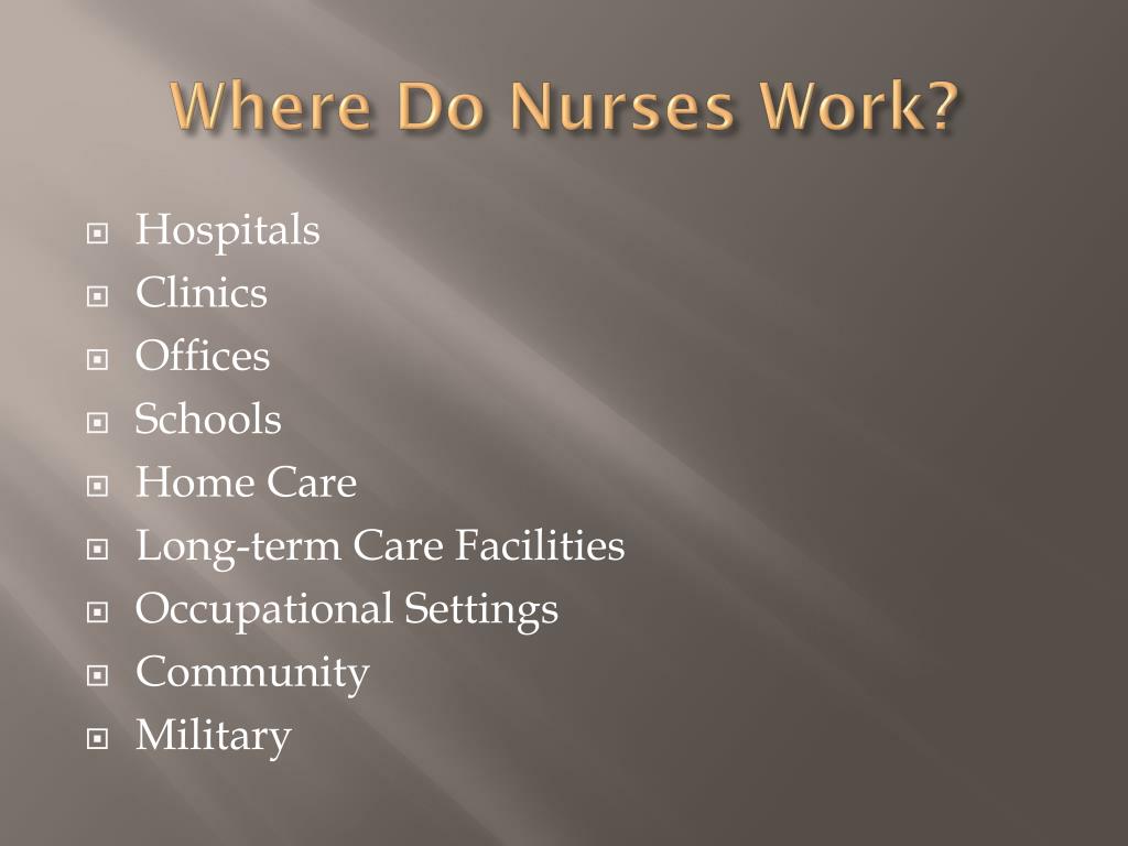 Where Do Nurses Work? • Hospitals • Clinics • Offices • Schools • Home Care • Long-term Care Facilities • Occupational Settings • Community • Military