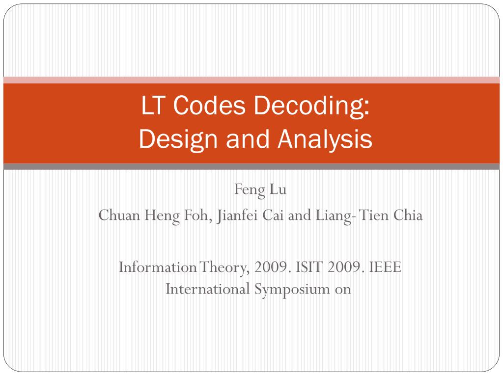 LT Codes Decoding: Design and Analysis Feng Lu Chuan HengFoh, JianfeiCai and Liang- TienChia Information Theory, 2009. ISIT 2009. IEEE International Symposium on