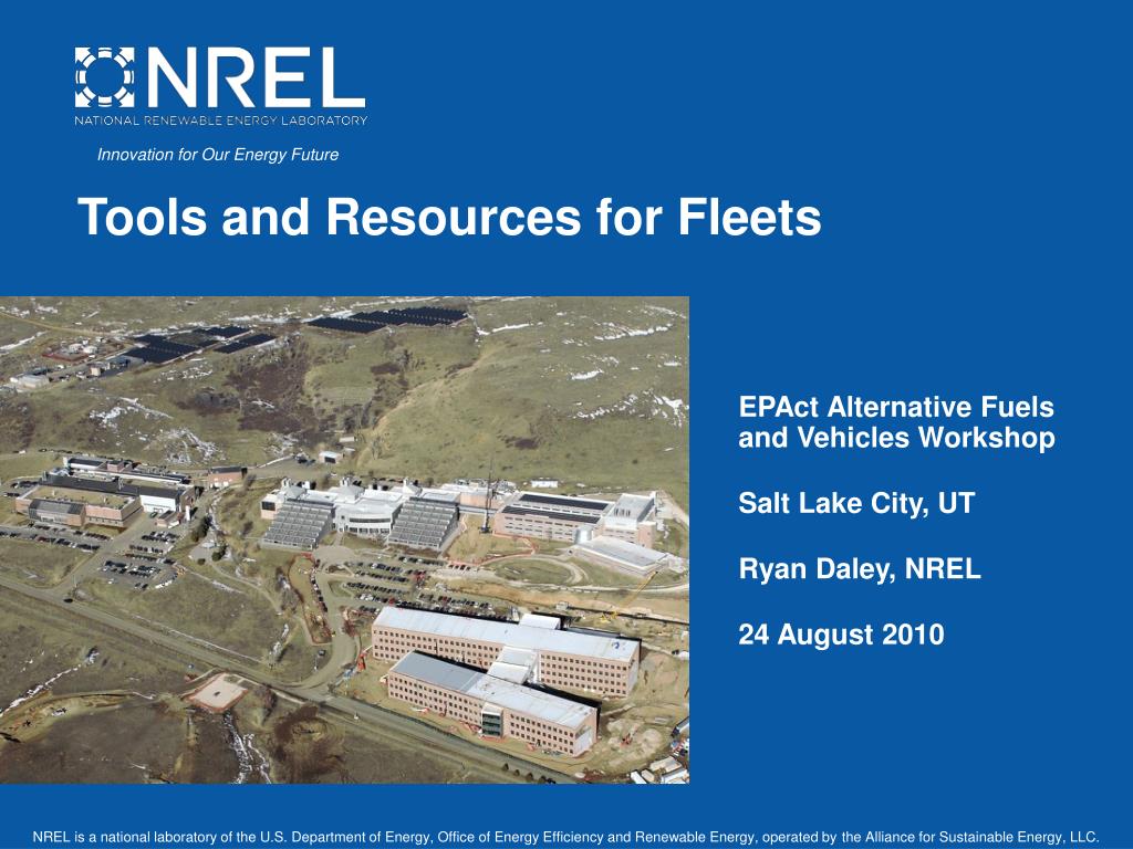 Innovation for Our Energy Future Tools and Resources for Fleets EPAct Alternative Fuels and Vehicles Workshop Salt Lake City, UT Ryan Daley, NREL 24 August 2010