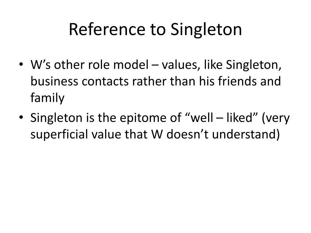 Reference to Singleton • W’s other role model – values, like Singleton, business contacts rather than his friends and family • Singleton is the epitome of “well – liked” (very superficial value that W doesn’t understand)